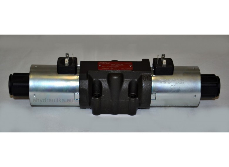 Dvoucívkový, 4/3 hydraulický rozvaděč, elektricky ovládaný, světlost DN10, zástavba CETOP5 . Napětí na cívkach 240 VAC. Konektory s LED-diodou v ceně ventilu. Šoupátko centrované pružinou, ve středové poloze všechny porty zavřené.