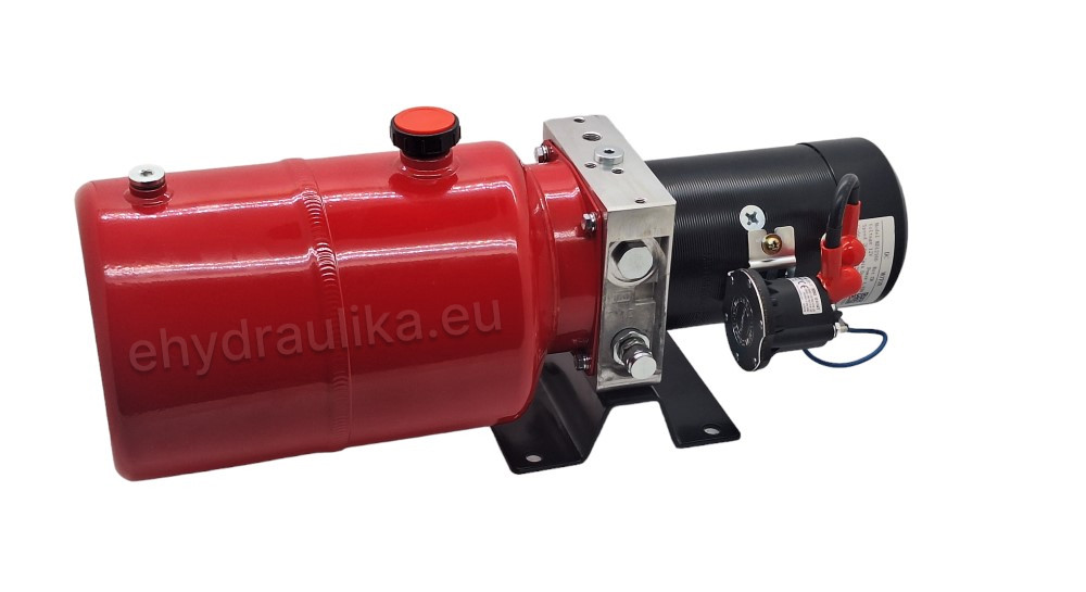 Kompletní hydraulický zdroj, čerpadlo 5,8 cm3/ot. Max. tlak 6,5 MPa (65 bar), 6L nádrž, 12V motor o výkonu 2,0KW a rychlostí 2700ot./min. Průtok max 15,6 L/min. Slouží jako zdroj tlaku pro všestranné použití. ovládání válce, přívěsu, sklápěče a pod. Agregát obsahuje také ventil pro spouštění zaváží dolů.
