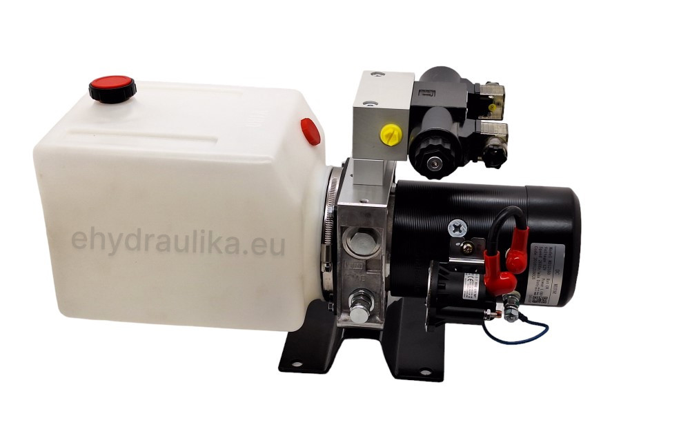 Kompletní hydraulický zdroj, čerpadlo 5,8 cm3/ot. Max. tlak 6,5 MPa (65 bar), 6L nádrž, 12V motor o výkonu 2,0KW a rychlostí 2700ot./min. Průtok max 15,6 L/min. Slouží jako zdroj tlaku pro všestranné použití. ovládání válce, přívěsu, sklápěče a pod.